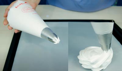 Отключите миксер и переложите полученную массу в кондитерский мешок с насадкой в виде звезды. Отсаживайте пирожные Павлова на противень, застеленный пергаментной бумагой в виде корзинки, формируя стенки и донышко для наполнения фруктами.