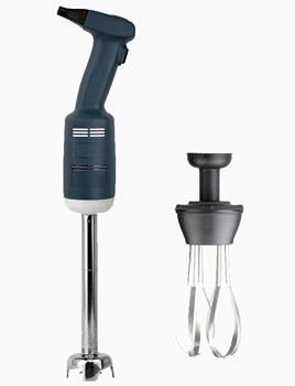 Профессиональный ручной погружной миксер для посуды объемом до 10 л. Скорость вращения: 2500 - 15000 об/мин. Комплектация: насадка-нож, насадка-венчик. Мощность: 220 Вт.