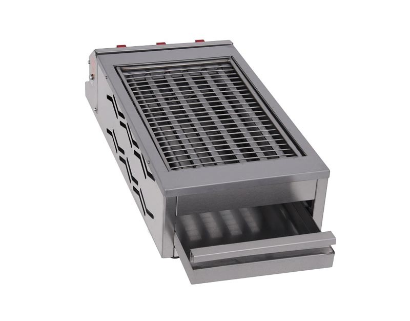 Под ТЭНами гриля расположен выдвижной поддон с водой для увлажнения, что позволяет готовить продукты, сохраняя их сочность. Жир, который выделяется во время приготовления, стекает в поддон.
