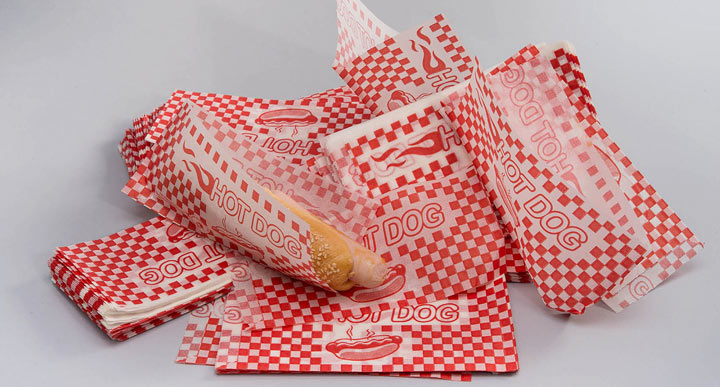 Уголок из белого пищевого, целлюлозного крафта, с рисунком "Hot Dog" - красная клетка.