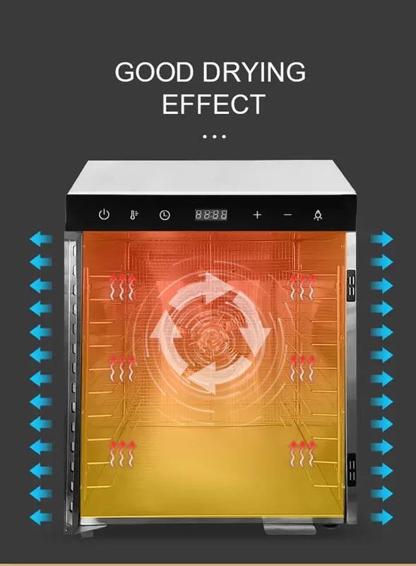 В модели DH-10H-BK нагрев происходит за счет нагревательных элементов, а вентилятор распределяет горячий воздух внутри сушилки для продуктов горизонтально, обеспечивая равномерную сушку продуктов.