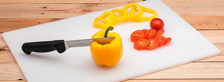 В соответствии с требованиями СЭС для нарезки и разделки продуктов следует использовать разделочные доски разных цветов: