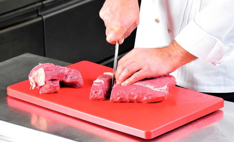 Профессиональная разделочная доска красного цвета используется для сырого мяса на предприятиях общественного питания.
