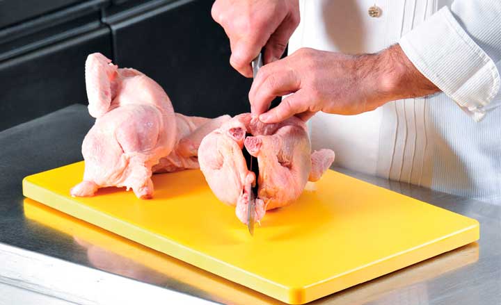 Профессиональная разделочная доска желтого цвета используется для разделки сырой птицы на предприятиях общественного питания.