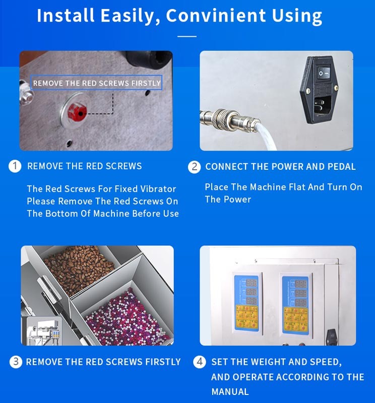 Подходит для дозировки крупных гранул (лекарственных трав, семян, пищевых продуктов, зерновых культур, риса, соли, специй, бобов) и продукты мелкой фракции (приправы, стирального порошка, металлического порошка). Вибрационные дозаторы не подходят для фасовки порошка имеющего слишком мелкую фракцию, склонного к залипанию и спрессовыванию (какао, мука и т.п.).