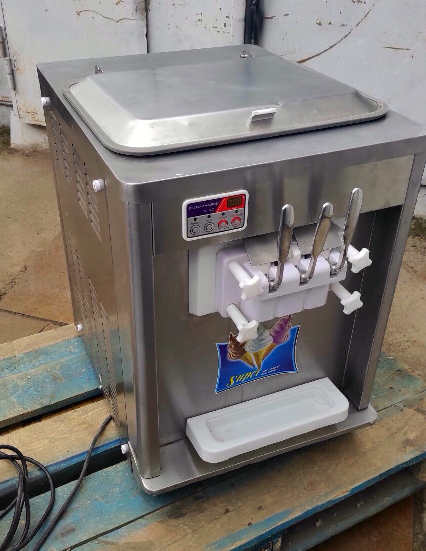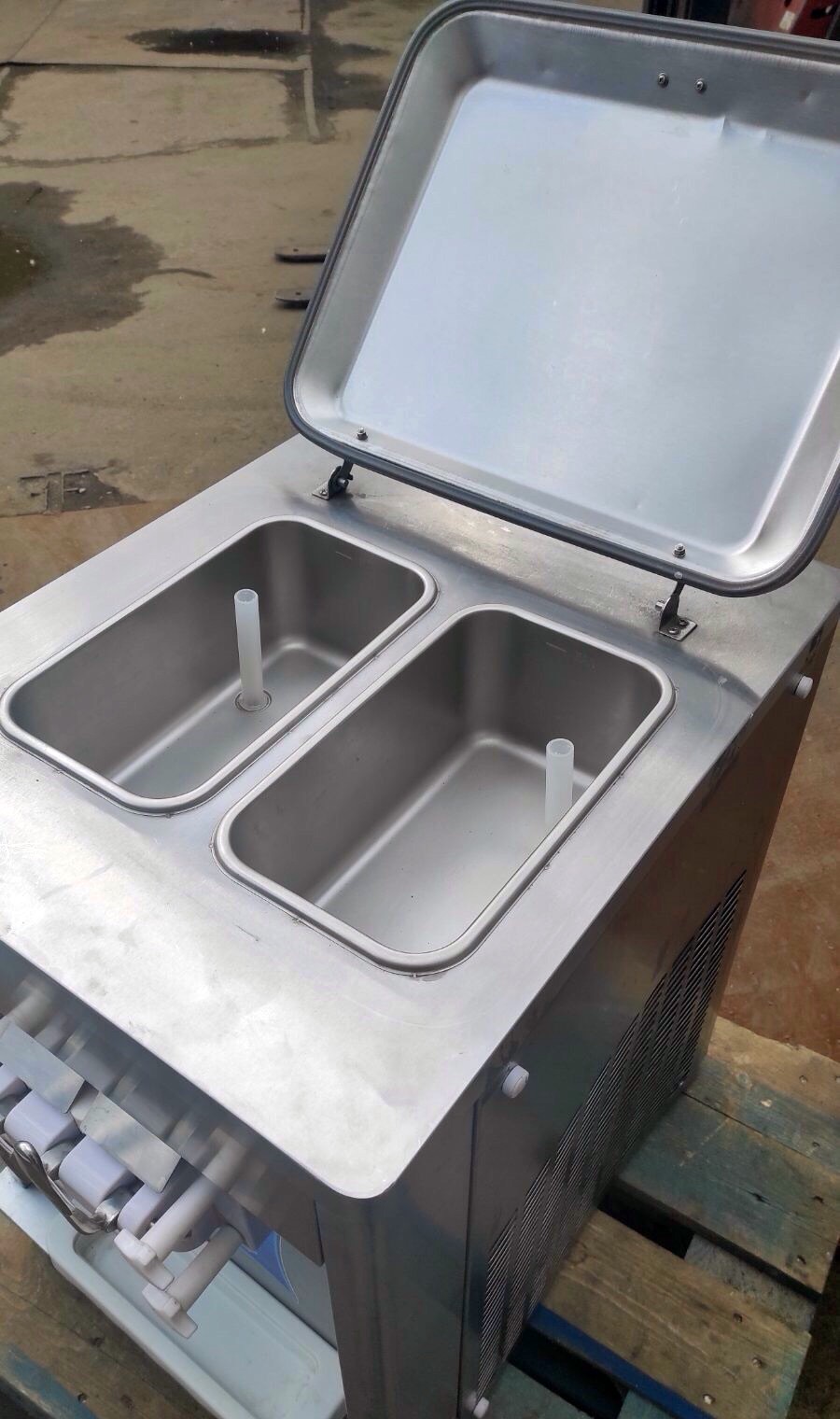 Настольный фризер для мягкого мороженого HIM-03 на 3 рожка, с электронной панелью управления. Позволяет использовать две смеси различного вкуса и оснащен функцией предварительного охлаждения (работает постоянно).