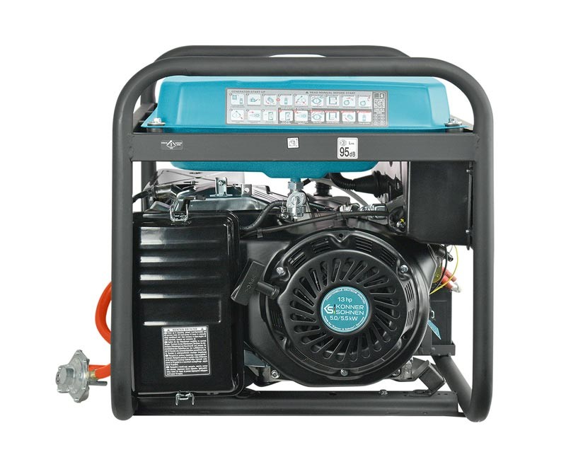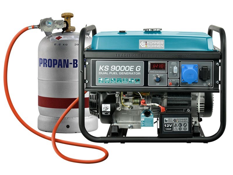 Газобензиновый генератор Konner&Sohnen KS 9000E G серии DUAL FUEL можно использовать как на бензине, так и на сжиженном газе (пропан-бутан). Эксплуатация генератора на газе повышает моторесурс двигателя. Всё необходимое для подключения баллона идет в комплекте.