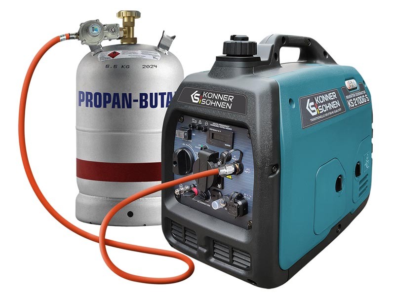 Инверторный газобензиновый генератор Konner&Sohnen KS 2100iG S в шумозащитном кожухе можно использовать как на бензине, так и на сжиженном газе (пропан-бутан). Эксплуатация генератора на газе повышает моторесурс двигателя. Всё необходимое для подключения баллона идет в комплекте.
