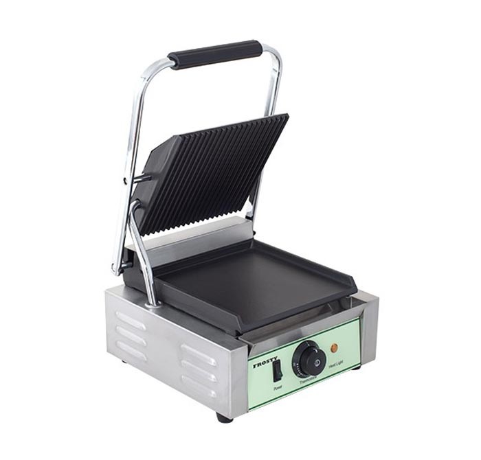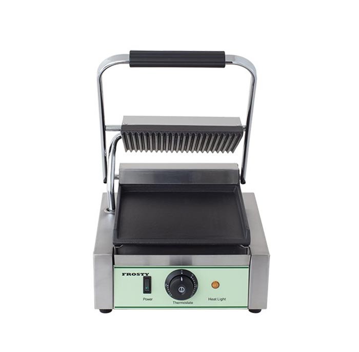 Прижимные плоскости электрического гриля FROSTY SP-1A2 комбинированные: низ - гладкая, верх - рифленая и изготовлены из чугуна, Верхняя и нижняя поверхность гриля разогреваются одновременно. Поэтому нет необходимости переворачивать продукты. Размер поверхности контактного гриля 220x230 мм.