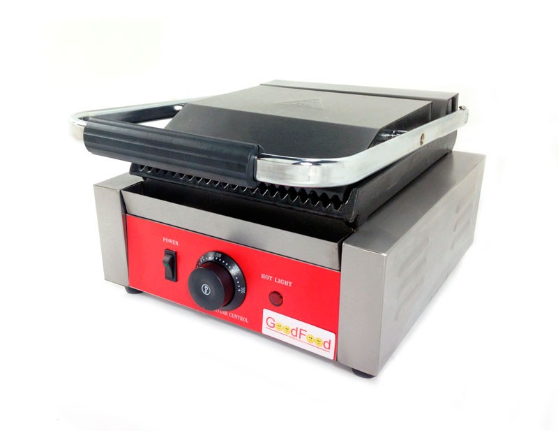 Прижимной гриль GoodFood ECG11 или как его еще называют гриль-тостер или контактный гриль используется для приготовления панини, шаурмы, гамбургеров, стейков, хот дога, булочек. Прижимной Гриль-тостер ECG11 позволяет разогреть и нанести на продукт рисунок гриля в виде поджаристых полосок которые оставляет поверхность прижимного гриля.