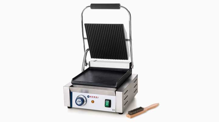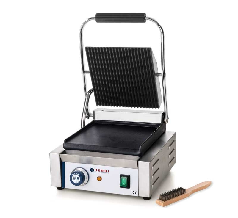 Прижимной гриль Hendi 263600 или как его еще называют гриль-тостер или контактный гриль используется для обжарки панини, шаурмы, гамбургеров, стейков, хот дога, булочек. Прижимной Гриль-тостер Hendi 263600 позволяет разогреть и нанести на продукт рисунок гриля в виде поджаристых полосок которые оставляет поверхность прижимного гриля.