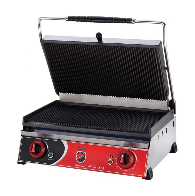 Прижимные плоскости электрического гриля Silver 2131 рифленые и изготовлены из чугуна, Верхняя и нижняя поверхность гриля разогреваются одновременно. Поэтому нет необходимости переворачивать продукты. Размер поверхности контактного гриля 485x270 мм.