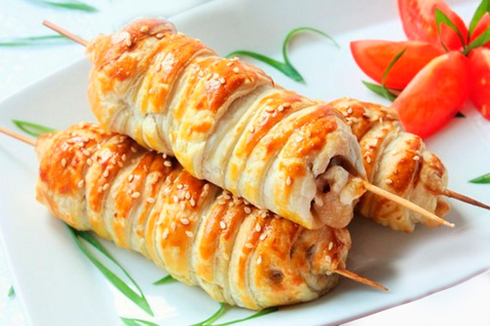 Тем временем тесто раскатываем. Делаем прямоугольник или квадрат. Края должны быть ровными. Нарезаем на одинаковые полосы. нанизываем курицу. Обматываем тестом плотно внахлест. Края теста с одной и с другой стороны фиксируем на шпажках, скрепляем между собой на концах, чтобы начинка была внутри и сок сохранился. Далее выкладываем шампура над противнем.