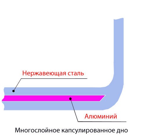 СЭНДВИЧ ДНО: Между слоями нержавеющей стали слой алюминия, благодаря такой конструкции образуется индукционный нагрев дна, посуда нагревается быстро и равномерно.