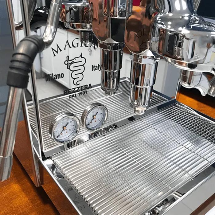 Bezzera Magica S MN работает с вибрационным насосом и группой ручных рычагов. Потянув рычаг вверх, насос активируется и начнется подача кофе, когда будет достигнуто желаемое количество кофе в чашке, потянув рычаг вниз, подача кофе будет остановлена.