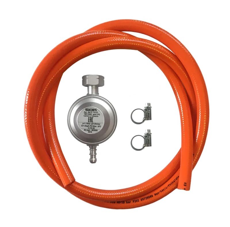 Комплект: газовый шланг 80 см, редуктор GOK 30 мбар, хомуты усил.