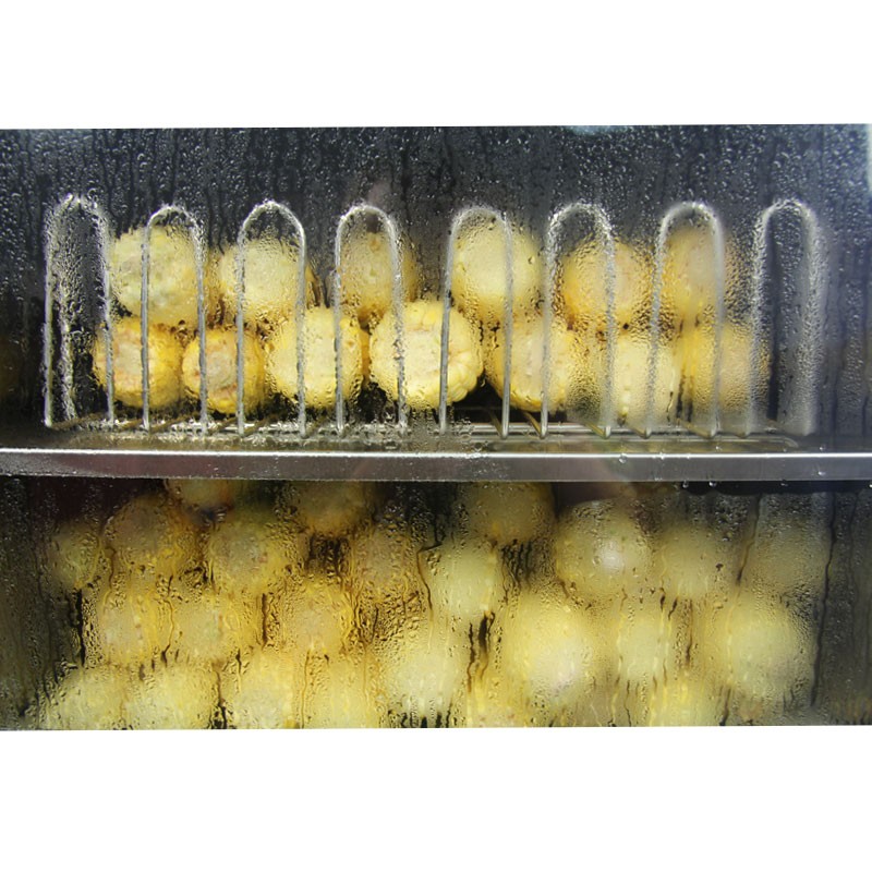Задняя стенка выполнены из стекла, что позволяет покупателям видеть процесс приготовления.