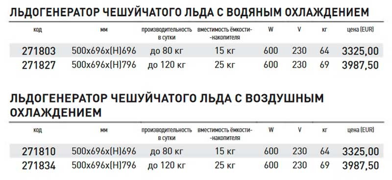 Льдогенераторы чешуйчатого льда Hendi - сравнительная таблица.