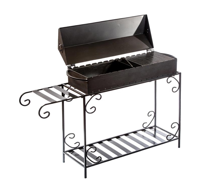Крышка-барбекю удобна для использования за счет петель и фиксаторов, закрепляющих ее в открытом положении. Воздухоотводящий клапан на крышке позволяет контролировать температуру внутри барбекю.
