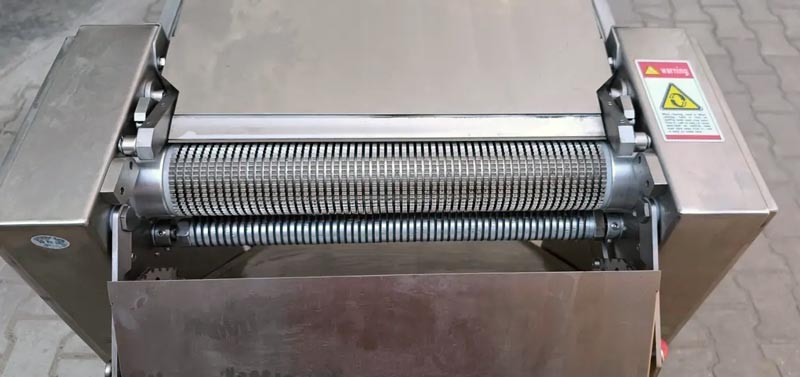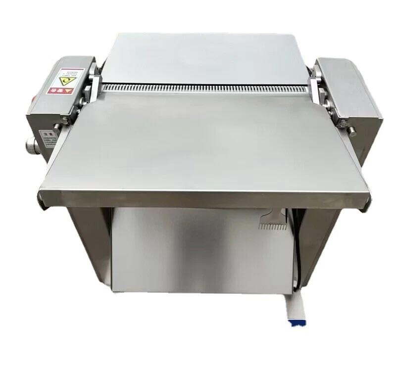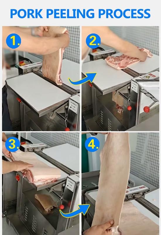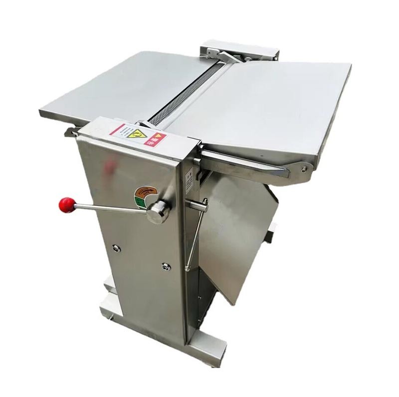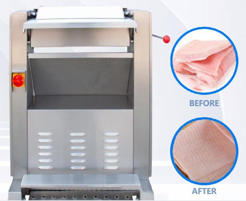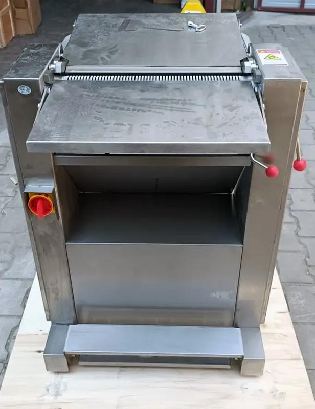 Машина работает за счет специального ножевого механизма и прижимного устройства, которое надежно фиксирует мясо. Толщина среза регулируется, что позволяет адаптировать оборудование под разные типы продукции. Диапазон толщины от 0,5 до 6 мм, обеспечивая аккуратное отделение шкуры без повреждения мяса.