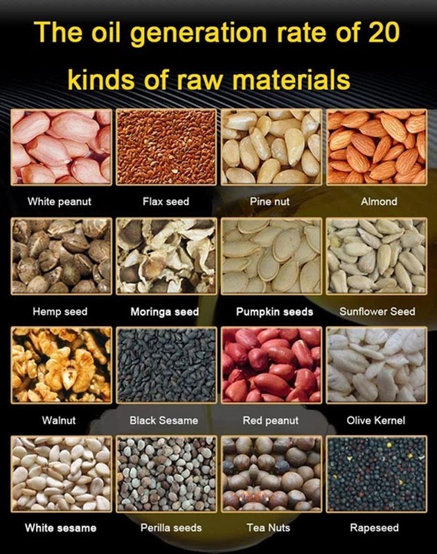 Семена, которые могут переработать с помощью масляного пресса Tekhniko OilPro Extractor OP-18: белый и черный кунжут, подсолнечник, арахис, лен, семена тыквы, горчица, расторопша, миндаль, ядро семян арганы, семена камелии, семена канолы (рапс), семена кокосовая мякоть, семена хлопчатника, зародыши кукурузы, семена травы, семена конопли, семена жожоба, семена киви, семена моринги, ядро семян немая, перец (сухой), сосна ядро ореха, семена шиповника, семена сафлоролий, и семена сафлоролий.