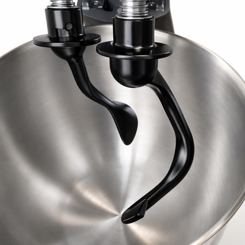 Планетарная система смешивания гарантирует тщательную обработку продуктов: насадка вращается вокруг своей оси и одновременно по периметру чаши, захватывая весь объём без пропусков. Благодаря высокой мощности двигатель легко справляется с большими нагрузками, что делает миксер идеальным выбором для замеса теста на хлеб, пиццу, сдобу и кондитерские изделия.