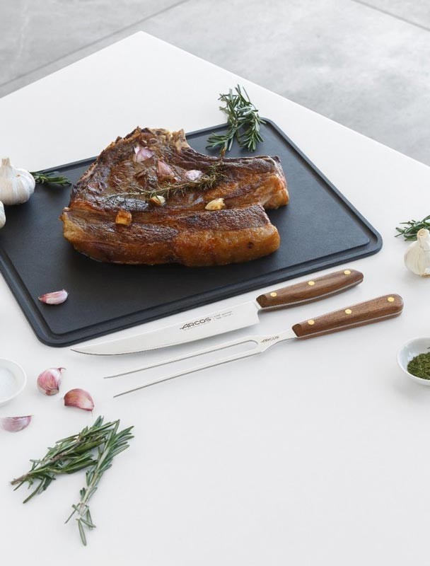 Набор Nordika Arcos 167000 состоит из разделочного ножа с длинным изогнутым лезвием (215 мм), позволяющий легко резать большие куски мяса, и разделочной вилки с двумя длинными зубцами (215 мм), которая помогает удерживать мясо.