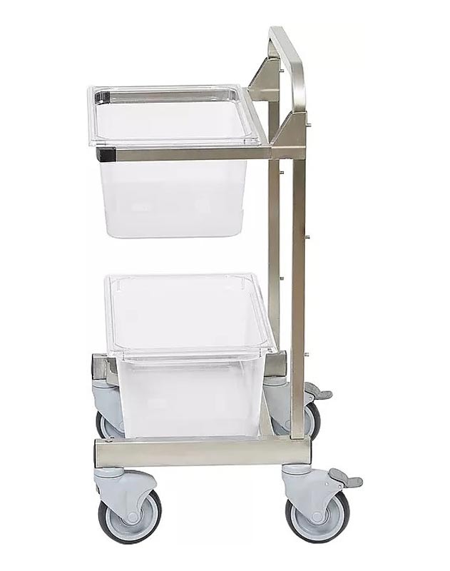 Тележка из нержавеющей стали с возможностью размещения стандартных гастроёмкостей, оснащена двумя колёсиками с тормозом для перемещения оборудования с минимальными усилиями.