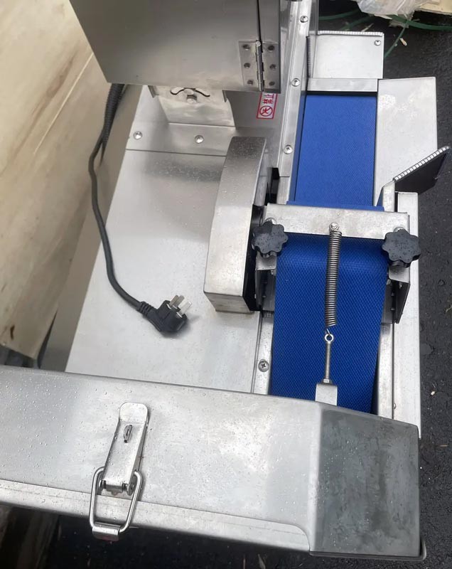 Основным преимуществом является движущаяся транспортерная лента и механизм прижатия (фиксации) продуктов к транспорту. Скорость транспорта регулируемая.