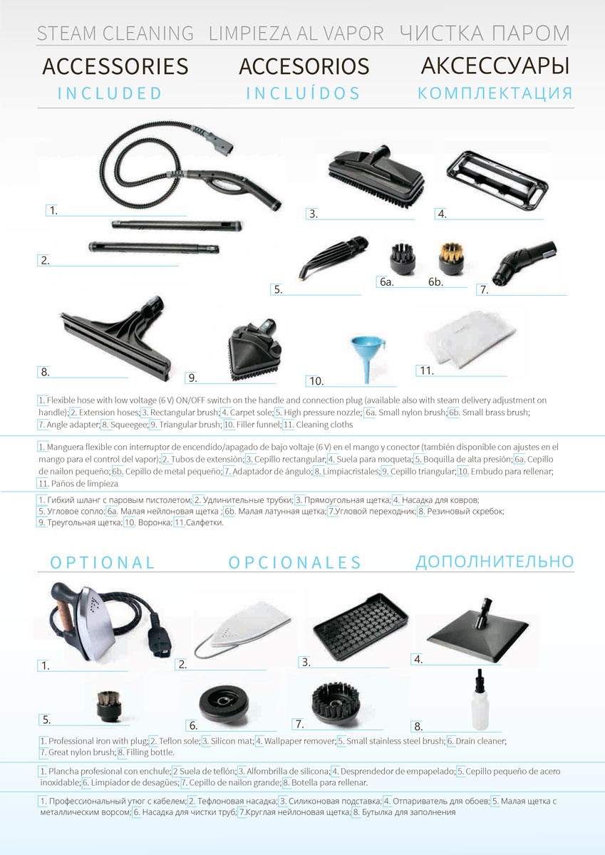 Насадки и щетки: щетка для уборки пола, щетка для ткани, круглая щетка, ручная насадка, насадка для мойки окон.