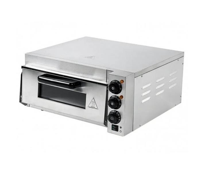 Однокамерная конструкция с размером рабочей зоны около 400×400 мм. позволяет готовить пиццу среднего диаметра, занимая минимум места на кухне.