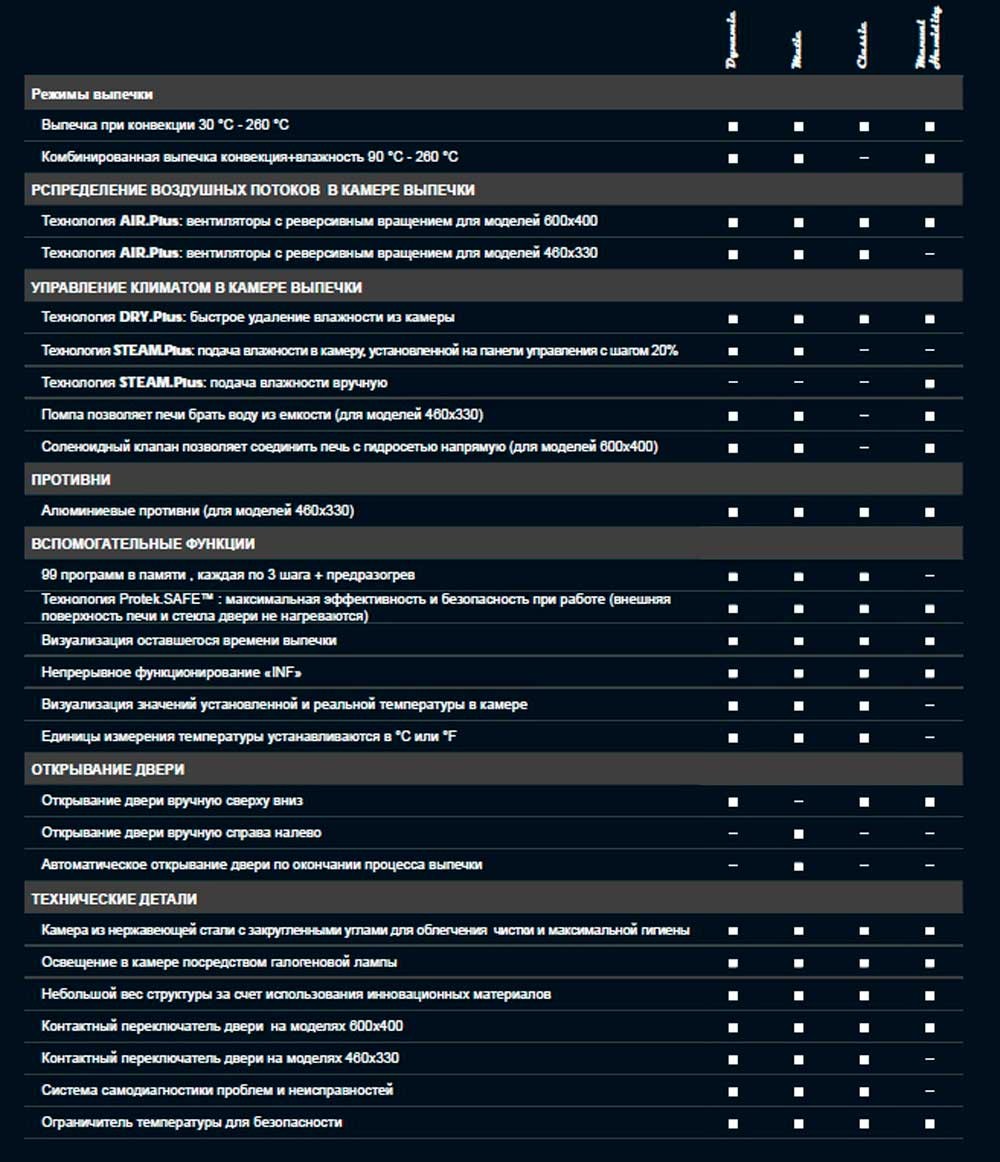 Применение увлажнения камеры значительно расширяет ассортимент хлебобулочных и кондитерских изделий. Подача влаги в камеру на первых минутах процесса выпечки способствует получению правильной внутренней структуры изделия и образованию внешней корочки. Технология STEAM.Plus позволяет получать пар в камере готовки при температуре от 90° C до 260 °C. В печах LineMiss™ Dynamic и Matic подача влажности в камеру готовки может быть установлена на уровне программы выпечки. Печи LineMiss™ Manual подача влажности в камеру готовки осуществляется путем нажатия кнопки на панели управления.