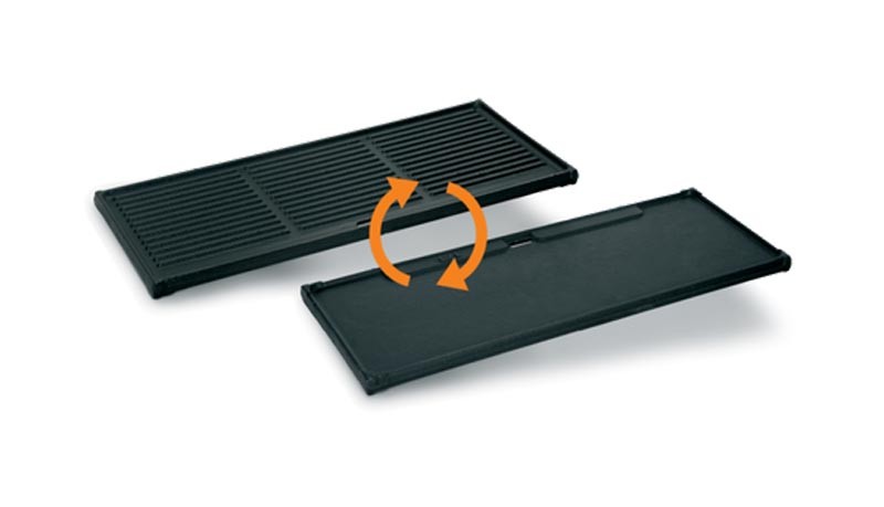 Двухсторонний чугунный противень с гладкой гриль-площадкой, рифленой поверхностью и отверстием для стекания жира. Применяется в газовых грилях Enders Kansas 3