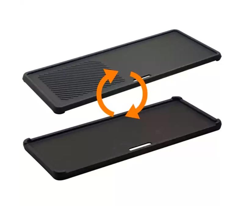 Двухсторонний чугунный противень 1/3 с гладкой гриль-площадкой, рифленой поверхностью и отверстием для стекания жира. Применяется в газовых грилях Enders Monroe 3