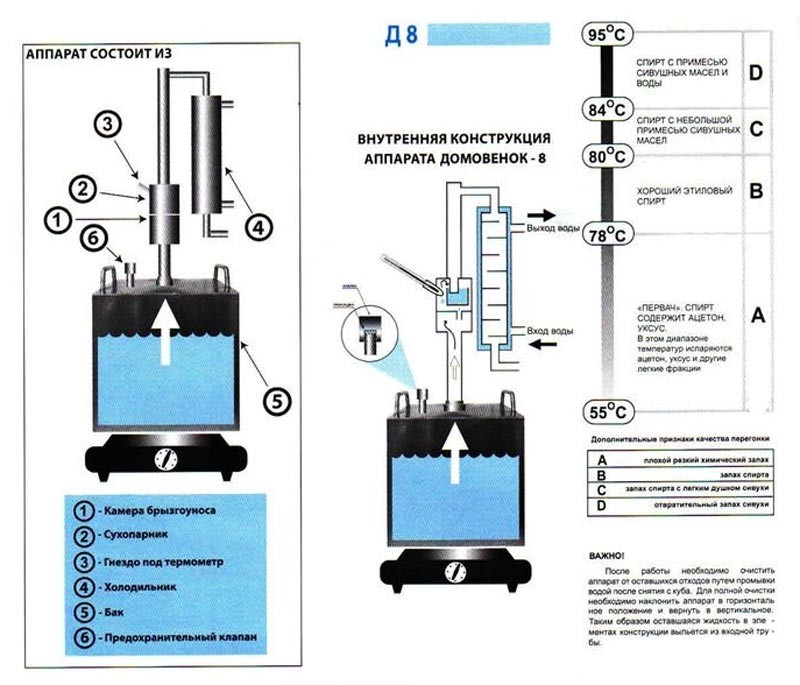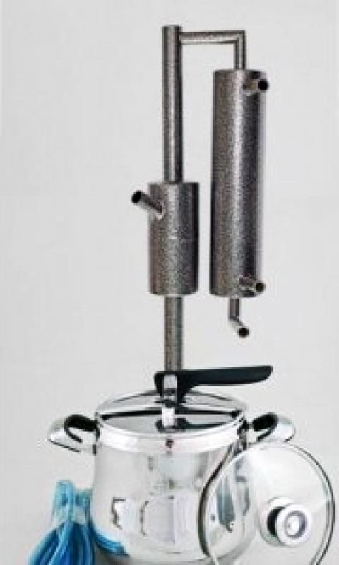 Конструкция самогонного аппарата включает холодильник, который выполняет функцию дистиллятора. Ректификационная колонна тарельчатого типа с девятью камерами, с помощью которых задерживаются сивушные примеси (дают возможность добыть из браги большой процент спирта).