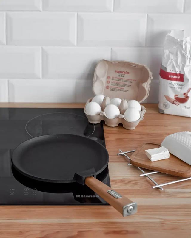 Сковорода для блинов Brizoll изготовлена из литого чугуна, ручка выполнена из ольхи. Чугунная сковорода может использоваться со всеми видами плит.