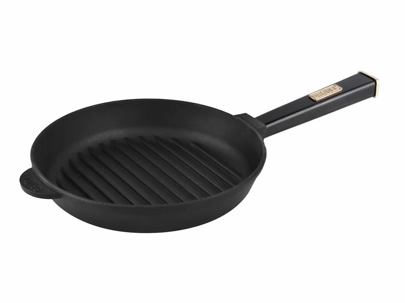 Сковорода гриль Brizoll изготовлена из литого чугуна, ручка выполнена из ольхи. Чугунная сковорода может использоваться со всеми видами плит.