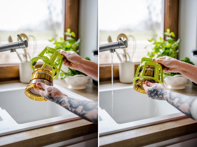 Легко мыть. Соковыжималку можно очищать водой при включенном двигателе - без разборки. Это уникальное преимущество может использоваться, когда необходимо выжать сок из разных продуктов, один за другим, чтобы их вкусы и цвета не смешивались.