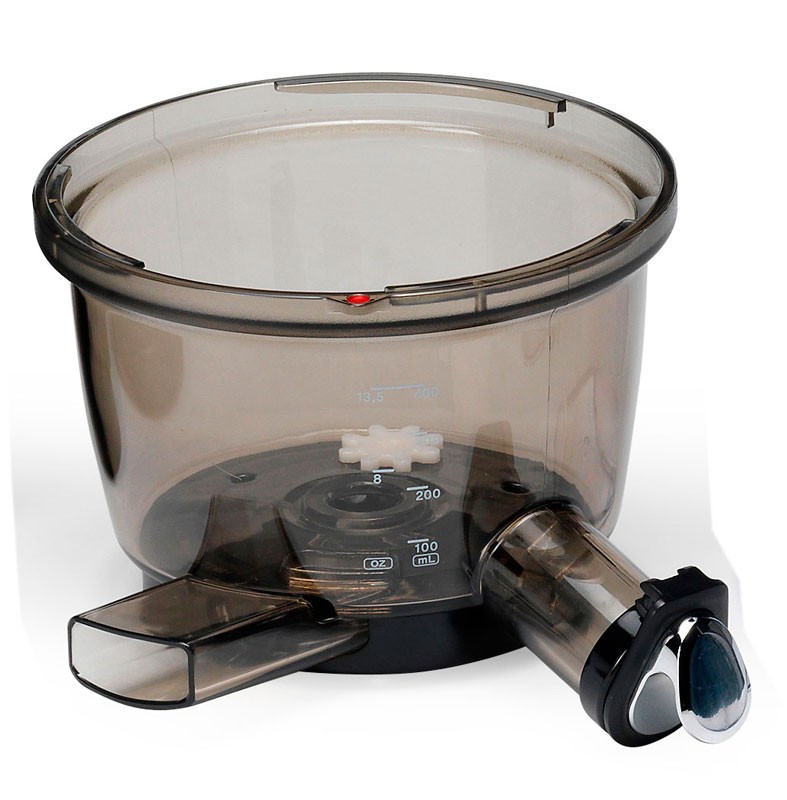 Обновленная конструкция шнека для наилучшей переработки волокнистых фруктов и овощей: белой и красной капусты, шпината, сельдерея, порея и т.п. При этом сведена к минимуму нагрузка на шнек и мякоть остается под ним, что облегчает приготовление живого сока.