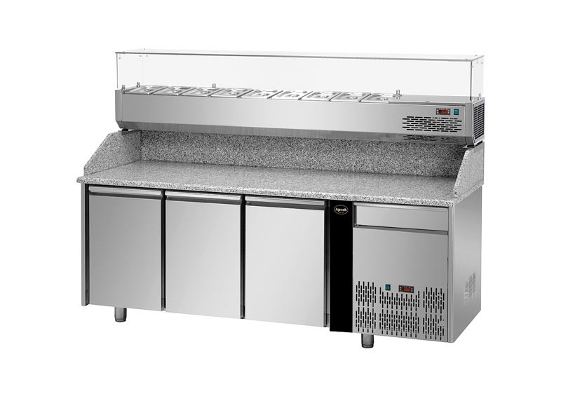 Холодильный стол для пиццы с витриной надстройкой EFC PZ3600TN R290 служит для хранения заготовок, необходимых для приготовления пиццы. На гранитной поверхности готовят краст и укладывают начинку.