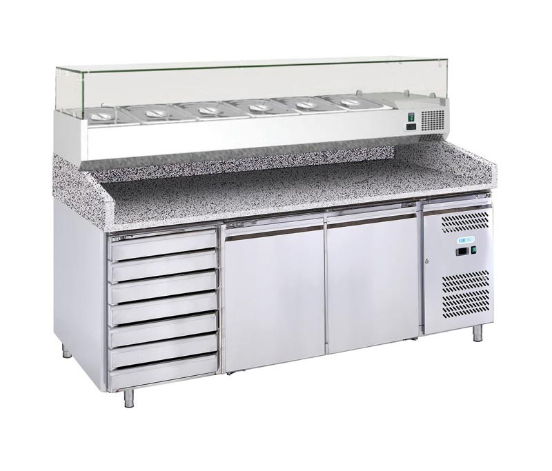 Холодильный стол для пиццы с гранитной поверхностью G-PZ2610TN-FC может использоваться вместе с холодильной витриной VRX2000-330/380 на 10 гастроемкостей GN1/4 (витрина и гастроемкости - опция, заказывается отдельно)