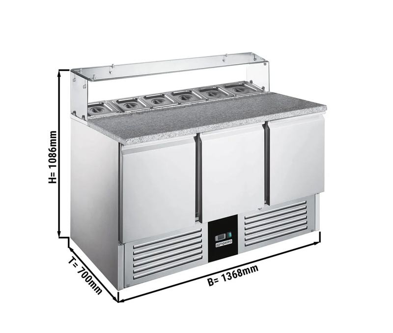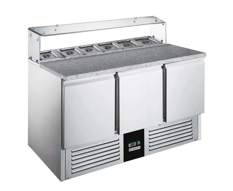 Холодильный стол для пиццы с салат-баром GGM Gastro SAG147OG#GSG147E служит для хранения заготовок, необходимых для приготовления пиццы. На гранитной поверхности готовят краст и укладывают начинку