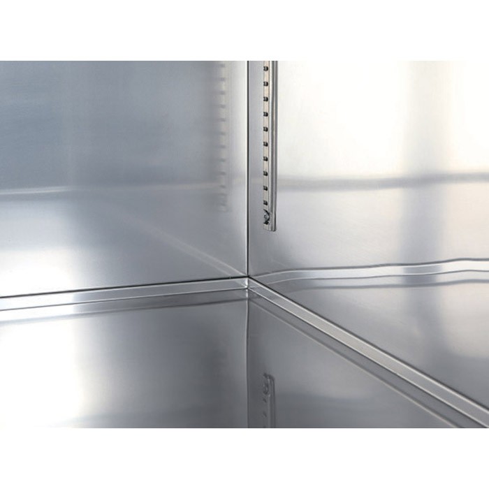 Корпус из нержавеющей стали. Корпус изготовлен из нержавеющей стали (гальванизированная сталь на оборотной стороне и внизу), острые углы оборудования сглажены, что является особой гордостью Turbo Air. Пол выполнен из нержавеющей стали с алюминиевыми вставками по бокам и сзади. Это гарантия долгого срока службы оборудования.