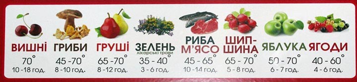 Эффективность сушки не менее 80% от массы исходного продукта в зависимости от вида продукта при температуре от 30 до 70 С и срока от 2 до 30 часов.