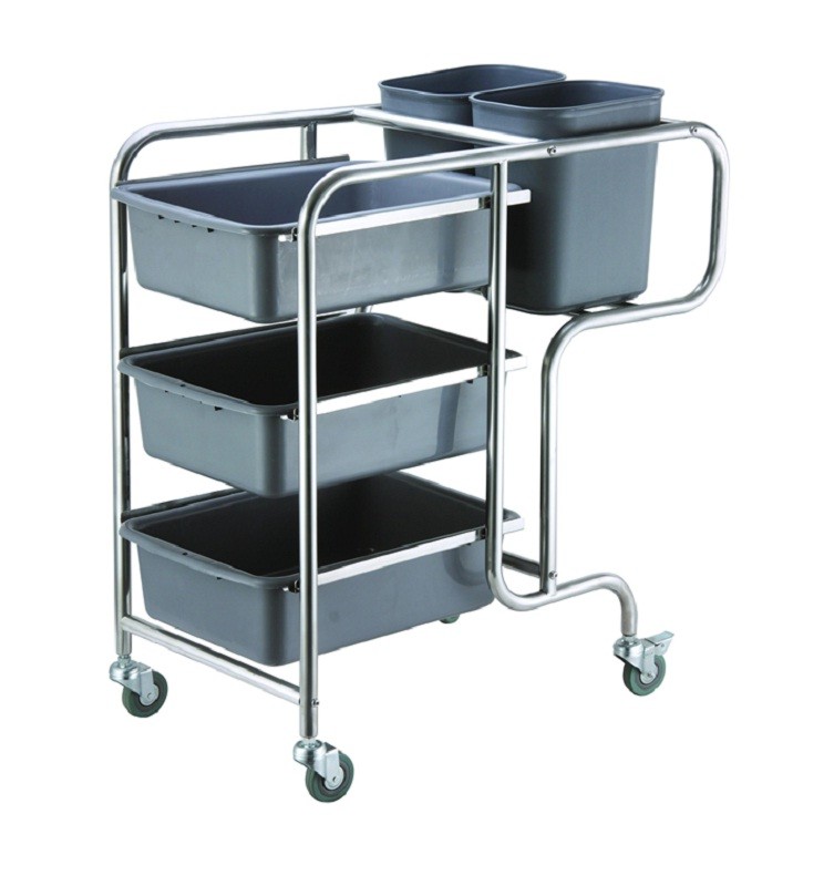 Тележки для уборки 120901 комплектуется тремя емкостями для сбора грязной посуды и двумя для сбора отходов.