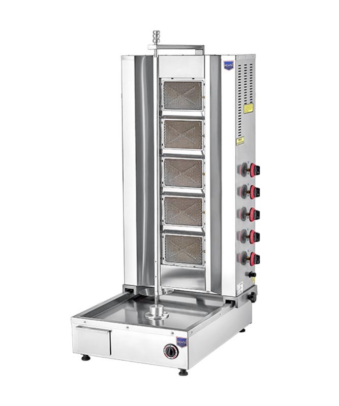 Головною особливістю апарату є наявність 5 незалежних газових пальників, які рівномірно прогрівають м'ясо по всій висоті шампура. Це дозволяє досягти ідеального прожарювання та соковитості продукту без пересушування. Завдяки нижньому приводу забезпечується стабільне обертання навіть за максимального завантаження, що особливо важливо для професійного використання.