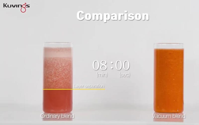 Вакуумний блендер Kuvings CHEEF CB-1000 всмоктує повітря зі глека перед змішуванням інгредієнтів. В результаті виходять яскраві кольори, відсутність розшаровування та можливість зберігання без знебарвлення.