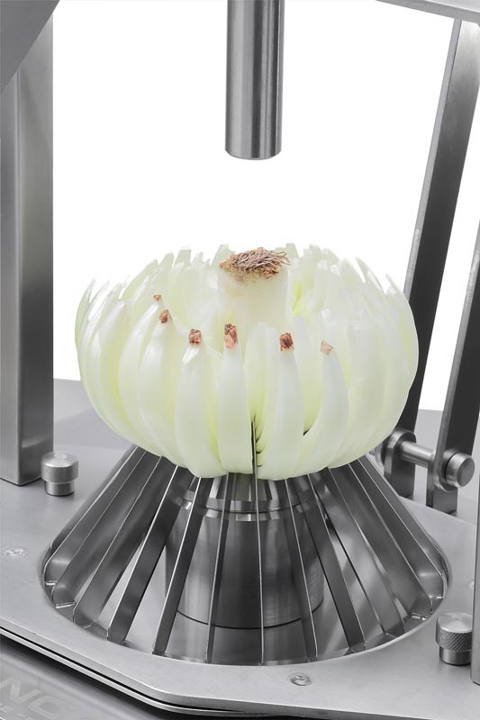 Гострі ножі нарізають цибулю на 24 рівні скибочки.