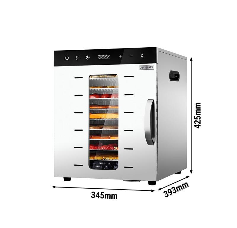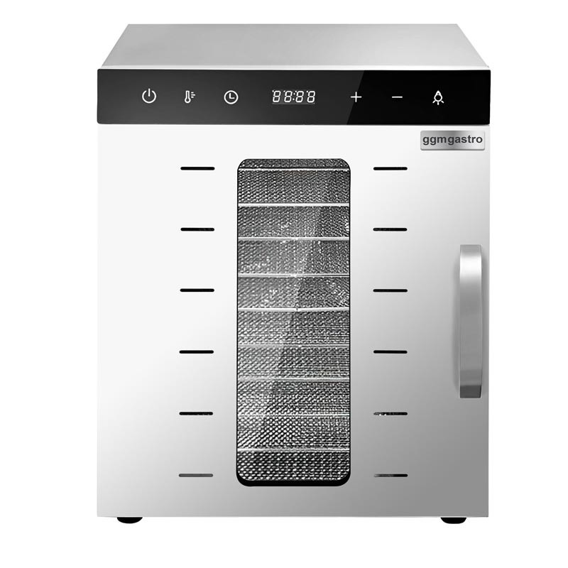 Професійний дегідратор GGM Gastro DGHB10 з горизонтальним обдуванням та десятьма лотками з нержавіючої сталі використовується для сушіння фруктів, овочів, м'яса, риби, грибів, для приготування сухофруктів, пастили.