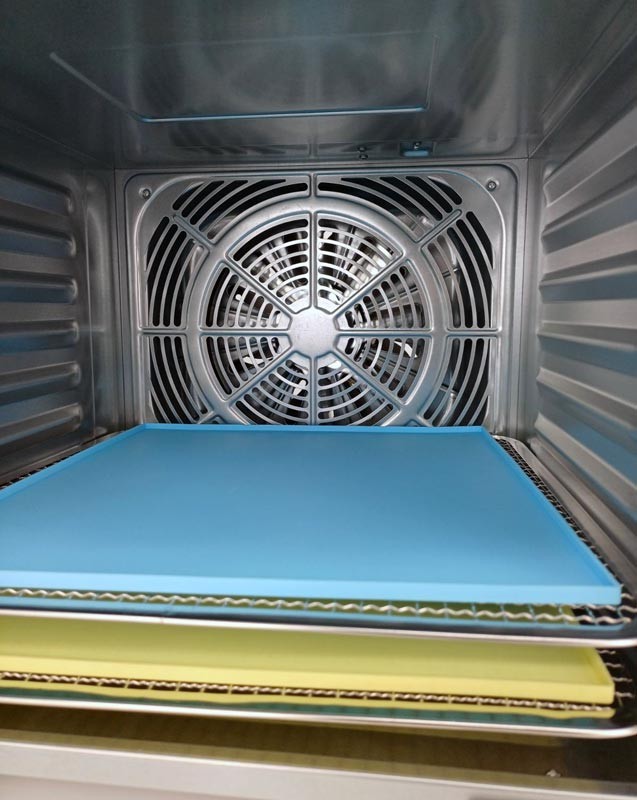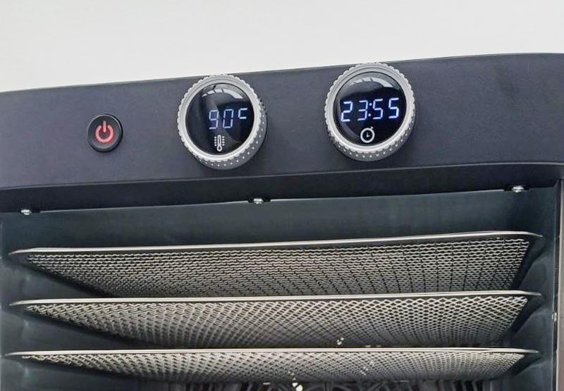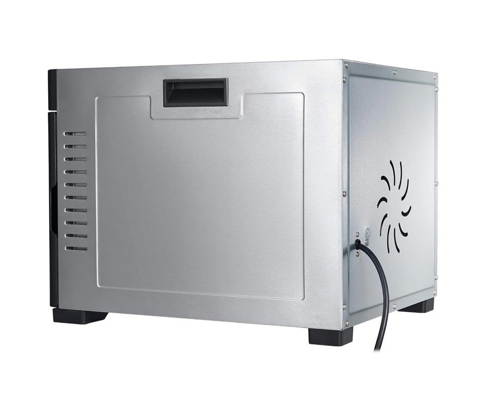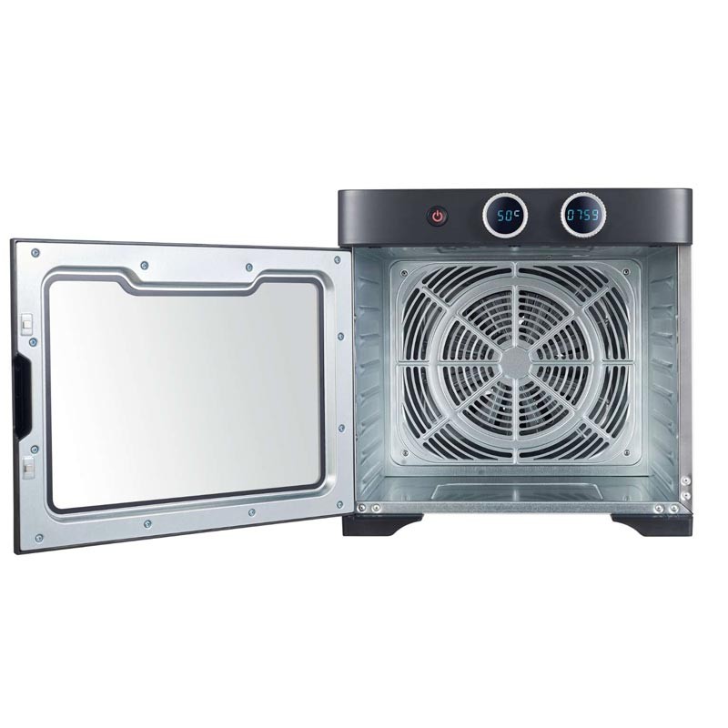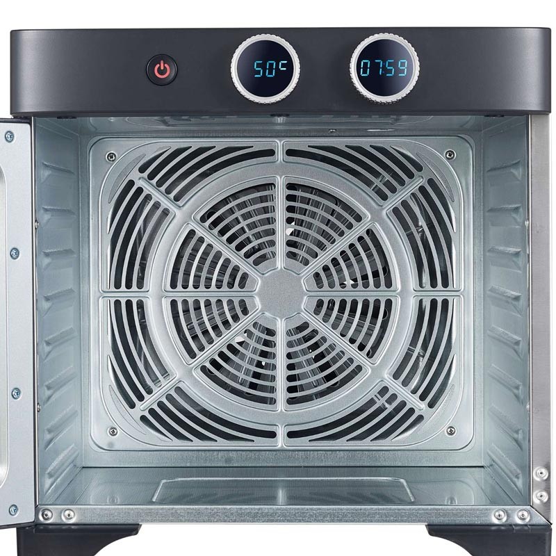 У моделі DH-08S-BK нагрівання відбувається за рахунок нагрівальних елементів, а вентилятор розподіляє гаряче повітря всередині сушарки для продуктів горизонтально, забезпечуючи рівномірне сушіння продуктів.